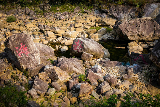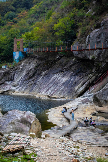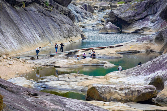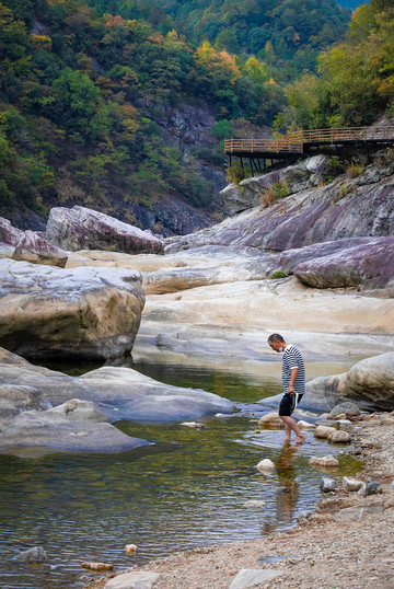 如果走在山间的栈道上觉得没什么意思,可以到河床上来一探究竟,不过一定要注意安全,只有玻璃桥的下方这个位置是可以行走的,这一处临水的石滩是我的最爱,在这里可以尽情的戏水,都说水至清则无鱼,但这里不仅河水清澈,还能看到许多游来游去的小鱼,坐在大峡谷的怪石上,倾听大自然悦耳的悦章,让你忘记了时光,忘记了嘈杂的人间。