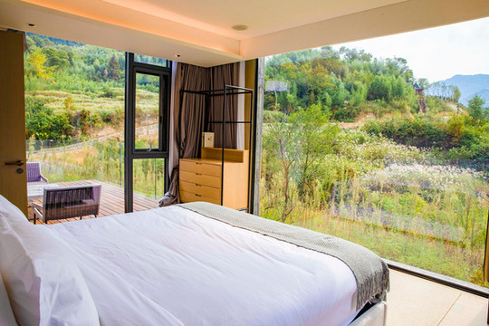 房间内就是一百八十度的超大落地窗,每天清晨起来,映入眼帘的就是绝美的山景,周边环境的真的赞,很适合假期休息度假。