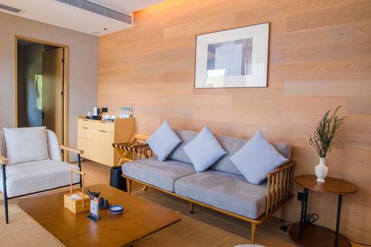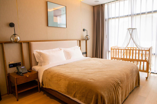 房间内的设计也是尽显奢华,房间的面积很大,功能分区也很合理,进门就是宽敞的客厅,每一间卧室都有独立的落地窗,窗外的美景打开窗帘就能看得到,房间里还准备了婴儿床,考虑的可谓是十分周到。