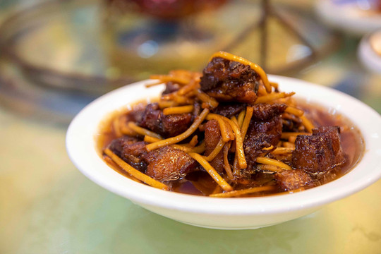 红烧肉是一道脍炙人口的美食,而金寨黑毛猪红烧肉更是别具风味,汤汁浓稠的红烧肉看着就无比的诱人,色泽红润很是娇嫩,肥而不腻的大肉块让人充满了食欲。