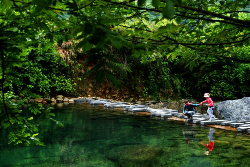 顺着小道继续前行,前方百丈崖峭壁嶙峋,怪石间流淌着潺潺溪水,水底沙石清透可见,下至水中,清凉从脚尖流过,心也随之慢慢静下来。站在劝善桥上,清风徐来,溪流峭壁尽收眼底,不时鸟叫声传来,声声入耳,令人心旷神怡。走下好汉坡,四叠瀑布出现在眼前,水流从山顶直飞而下,落在石头上激起飞溅的水花,瀑布尽头的小潭却十分平静,与瀑布动静交织,趣味无穷。