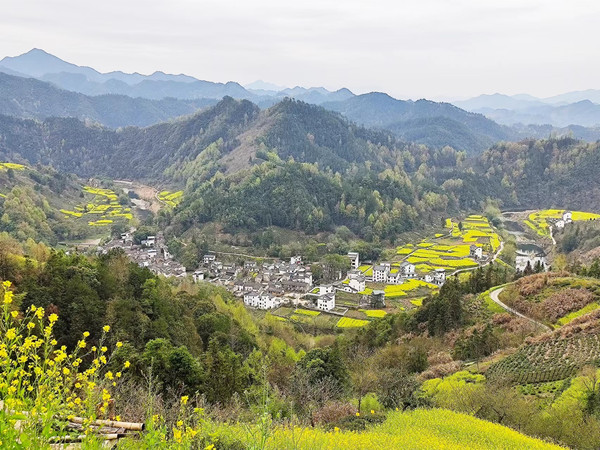 14.46到达绩溪北站。出站左转走200多米就是汽车站,乘6路公交车,15.10发车,15.35在龙川的前一站恬然农庄下车,车站对面的小路上山,俯瞰登源河及两岸粉墙黛瓦的徽派村落,漫山遍野的油菜花点缀其中,皖南的春天太美了。天公作美,多云转晴,很出片。下山后一直沿着登源河向景区方向走。