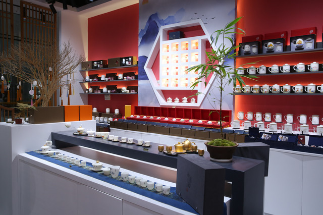 在瓷艺城,各大高端陶瓷品牌销售展厅向来者展示着自己的“瓷”魅力:成艺陶瓷的“万花不落地”茶壶壶身由青花瓷、珐琅彩花与描金白瓷组成,既有清新淡雅的古韵风味,又尽显雍容闲雅姿态;韵丽陶瓷公司的《天香富贵》瓷板画上牡丹绽放,花瓣是雅致的鹅黄色,渐变自然,工艺高超;金马车陶瓷公司独创的“弘一心经杯”深谙禅意美学,弘一大师的《般若波若密心经》手稿铺展于白瓷杯上,朴拙圆满,一派庄重典雅。