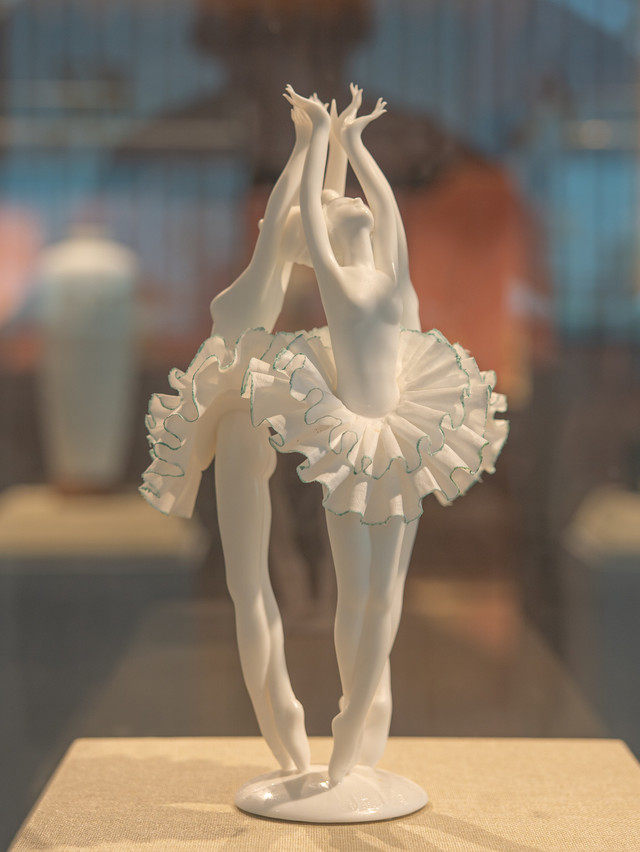 走进瓷艺城大师馆,映入眼帘的便是中国工艺美术大师许兴泰的白瓷作品《观音头像》,观音头梳发髻,经过许兴泰打磨的秀发纹理分明,细腻温润。另一处展柜呈现的《天鹅湖》由柯宏荣、陈桂玉共同创造,三位芭蕾少女踮起脚尖、高举双手,在渺渺乐曲中一展舞姿。邱双炯制作的仕女持扇轻笑、神态娇柔,她身着绫罗,瓷土烧制的裙摆皱褶如水波粼粼,仿佛当真由绸缎编织而成……诸位大师作品齐聚一堂,无声交谈中,尽显德化陶瓷美学魅力。