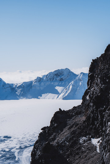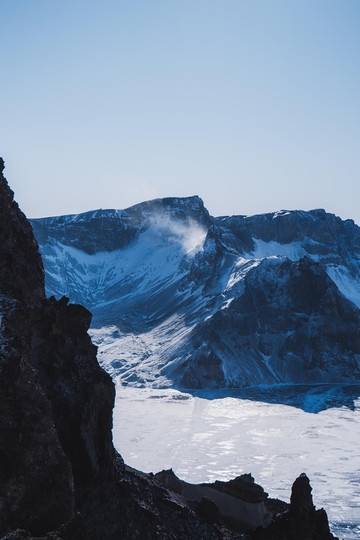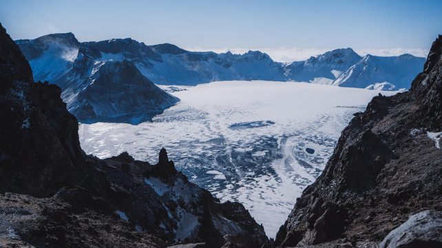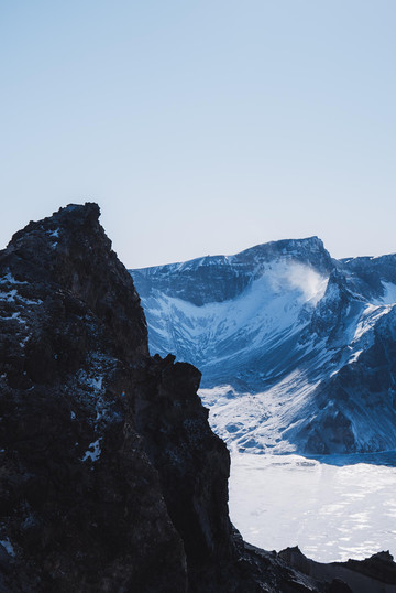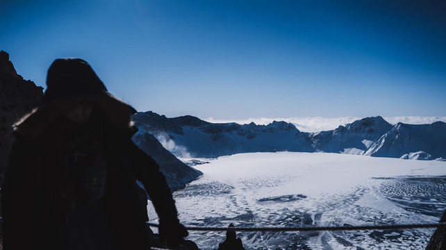 不得不说的是,天池的景色有多么的震撼,湖面也基本都已经结冰了,深蓝色的湖面看起来想贝加尔湖一样,深邃又沉醉。