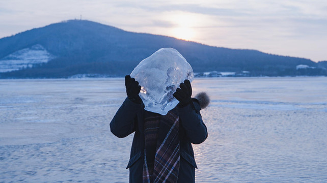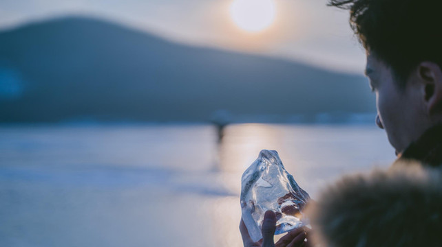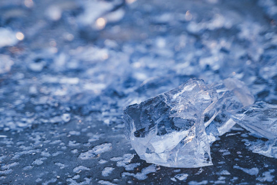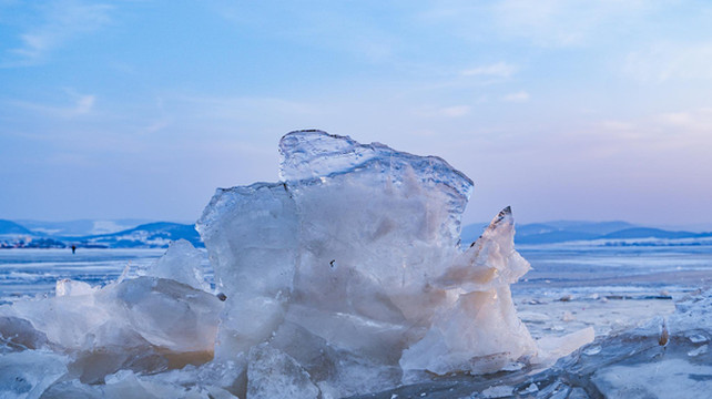 坚硬的冰块散落在湖面上的各个角落,它们都像是一颗没有成型的钻石一样在夕阳下耀眼夺目,