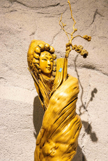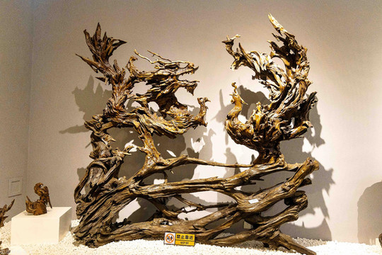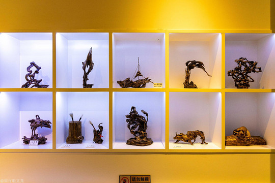此外,在馆内我们还可以参观松花湖浪木根雕艺术展,特别具有吉林地方特色。什么是松花湖浪木呢?它们和普通树根有什么区别呢?早在30年代,松花江上游拦江筑坝,修建电厂,使松花江水位上涨,沿江林木被浸入湖中,经过常年湖水的侵蚀冲刷,日晒雨淋,才形成了今天的松花江浪木。它比普通树根坚硬很多,形状千姿百态。浪木根雕就是根据它原本的形态去雕刻的。这也便是浪木根雕的特点——七分天成,三分雕琢。艺术展展出了吉林市松花湖浪木艺术研究会会员雕刻的浪木根艺127件。你看它们,有的似船,有的似鸟,有的似人,有的似牛......我最喜欢这个女性人形根雕和龙凤根雕,真的特别精致,观赏性极强。