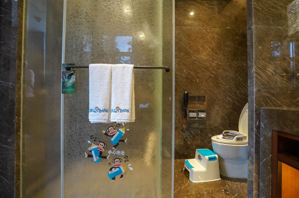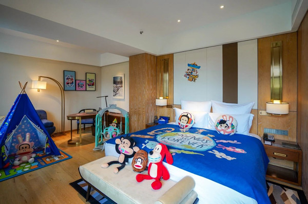 亲子家庭,可以选择酒店的主题亲子客房。有小黄鸭和大嘴猴主题亲子房,房间布满了卡通元素,帐篷、布偶、杯子、毛巾都印有可爱的卡通图案,细节之处也十分到位,小朋友住进来一定会爱得不行。