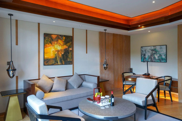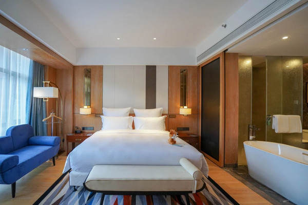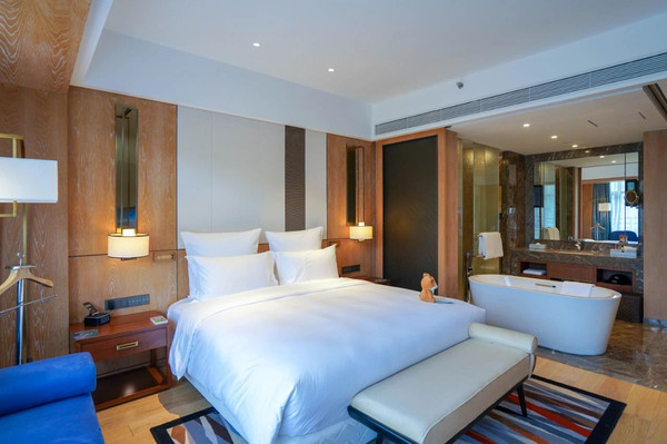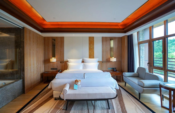 开业一年,酒店房间设施都很新。酒店共有299间客房及套房,分布在5栋互相连接的建筑中,房间面积42平米起,大部分客房设观景阳台。或观林景或赏山景,大床房配的是特大床(2米*2.1米),二娃家庭睡得也是妥妥的舒服。