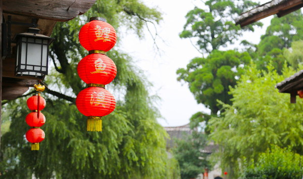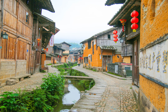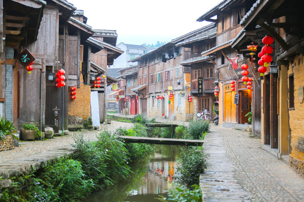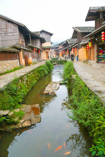 整个古村,沿着蜿蜒的小溪而过,溪边的老街还保留着旧日的韵味:青石板、木房子,古老的土墙和泛黄的木门,老房子上挂着一些红色灯笼,有点陈旧,却展现出了人与鱼之间和谐共处,融为一体的美好画面,独特的“人鱼”文化。