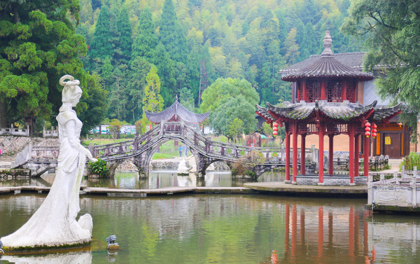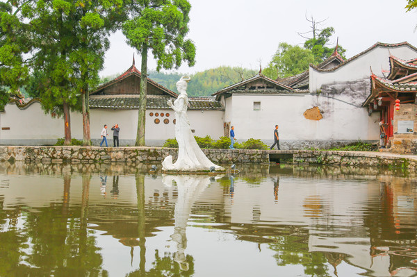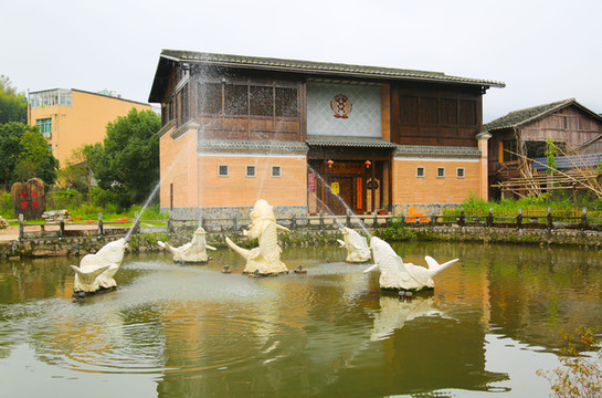 走进浦源村村口有一个池塘,一座古桥横跨在池塘上,中央塑有形态各异的鱼雕,“鲤鱼仙姑”雕塑、观鱼亭台、水榭小桥,颇有 江南 的韵味~