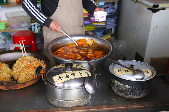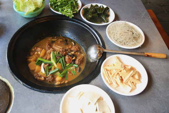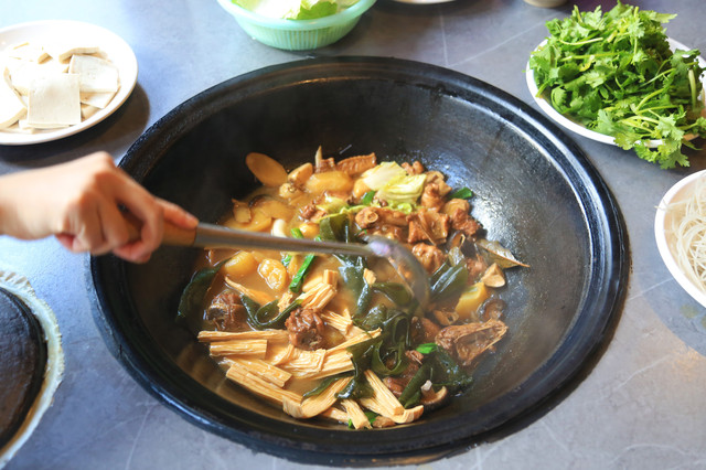 我们不太能吃辣,所以点了不辣的走地鸡,如果同桌有不吃辣的,可以点不辣的锅,吃辣的和阿姨要一碗辣椒酱沾着吃。另外肌肉需要40~50分钟炖,所以一定要提前和前台点餐喔!另外点了海带,粉丝,香菜,豆腐,白菜,牛肉饼。3个人完全吃撑了!(第二天早餐有牛肉饼,大家如果有吃民宿早餐就可以不用点)