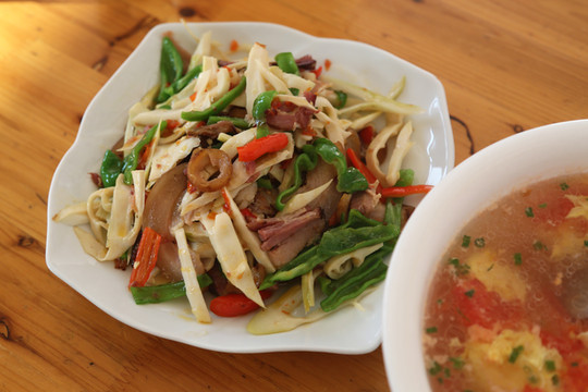 一路上吃了自带的食物,到了板壁岩看到有热食,好激动!推荐萝卜牛杂汤和炕土豆,炒饭也不错,搭配自家腌制的酸泡菜好开胃。一碗热乎乎的萝卜汤下肚,补充元气!