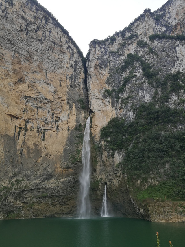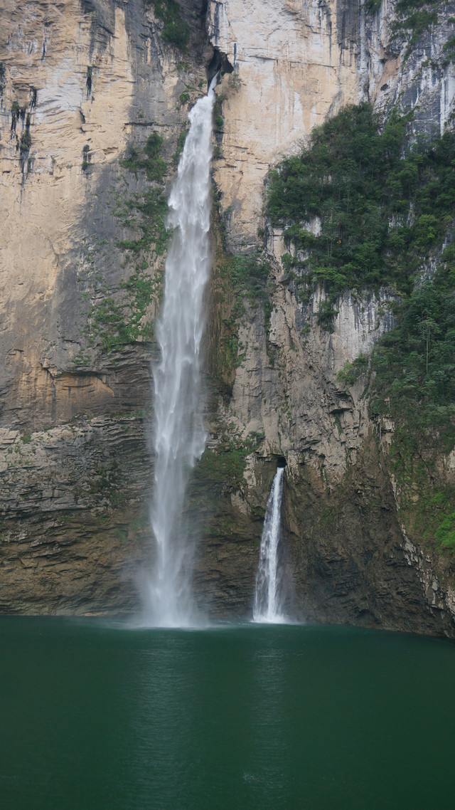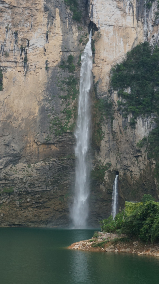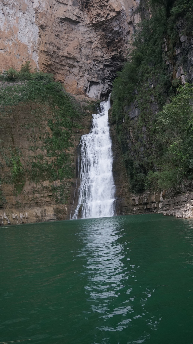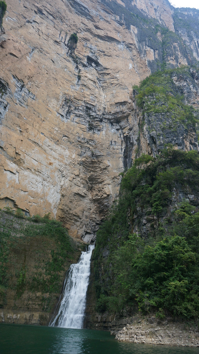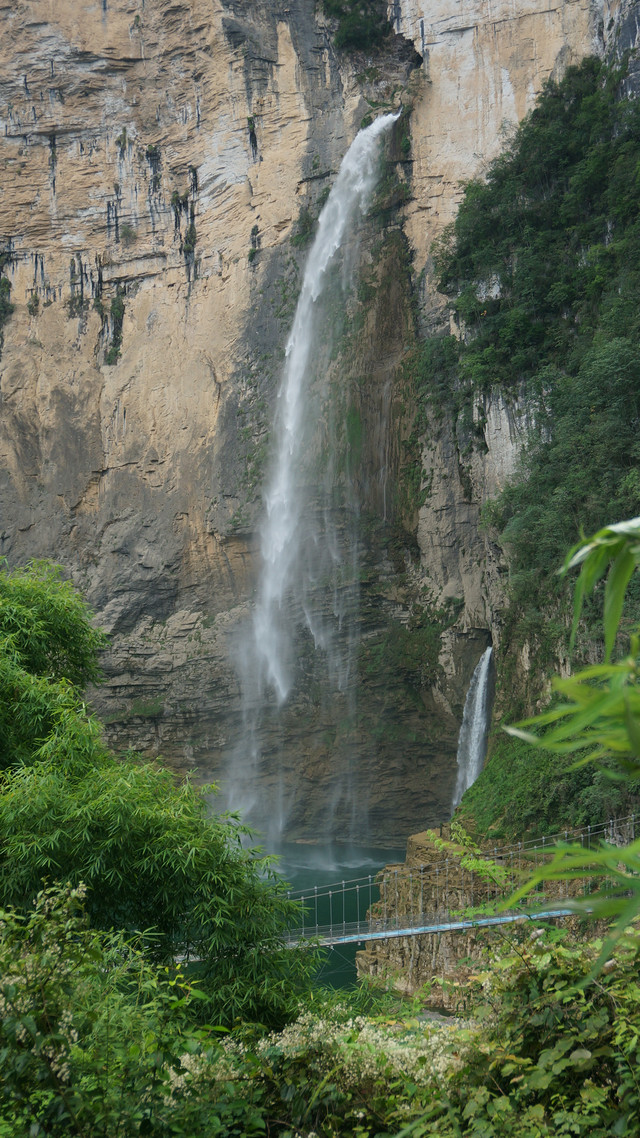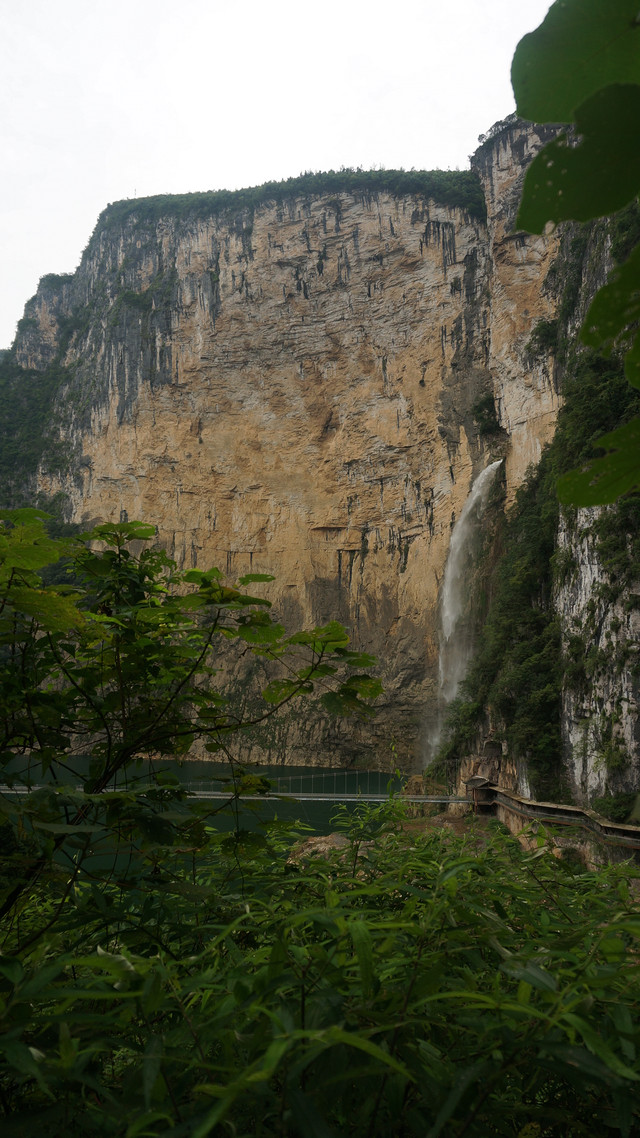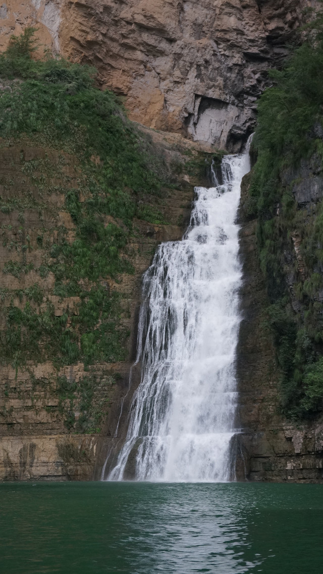 两片岩壁的缝隙间,一挂瀑布从180多米高的峭壁中喷射而出,倾泻而下,落入一湾碧水之中。这就是龙湾五绝之一“龙湾瀑布”如遇雨后,则水量颇大,如白龙腾飞,气贯长虹,非常壮观,故也称“腾龙瀑布”。今天的水量一般般,显得比较清秀。