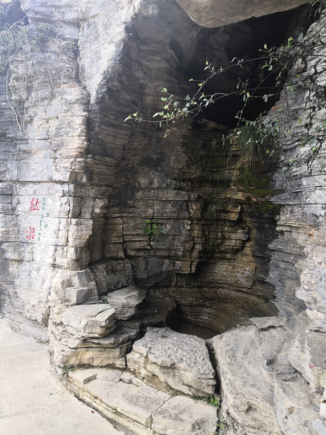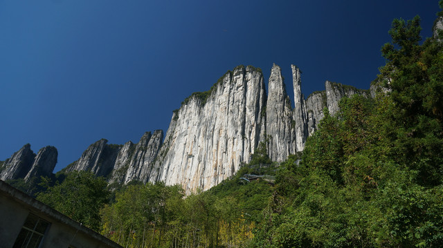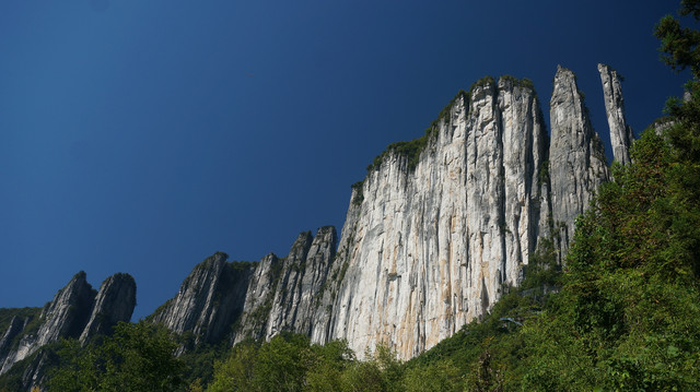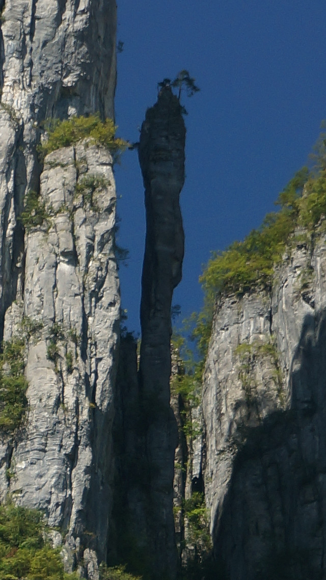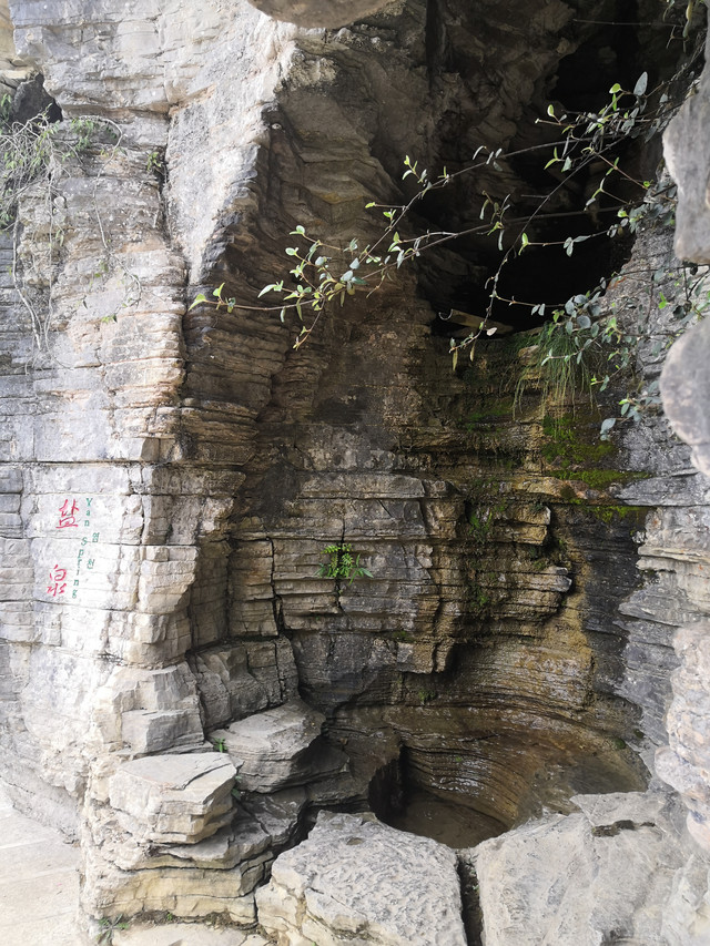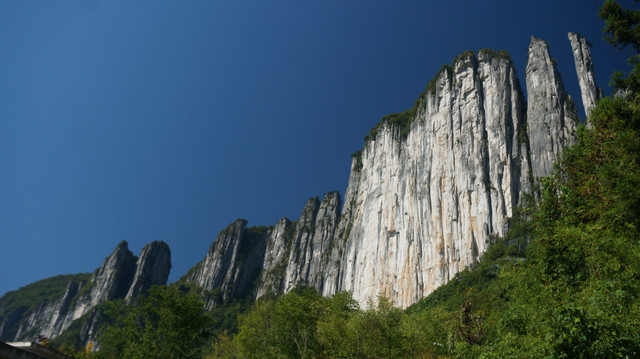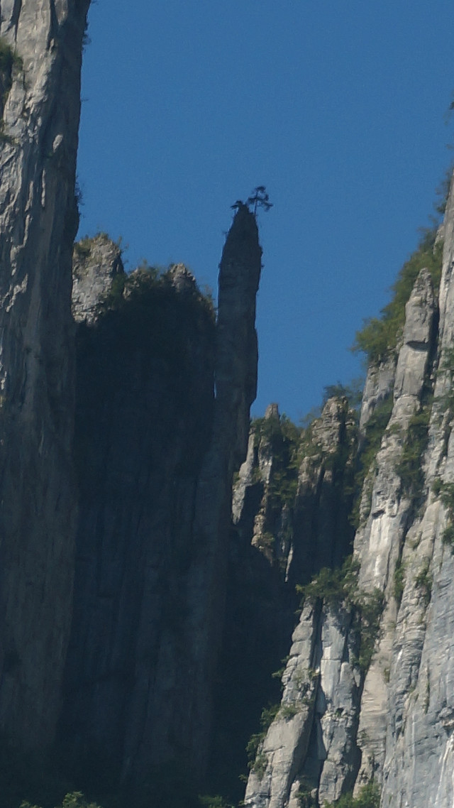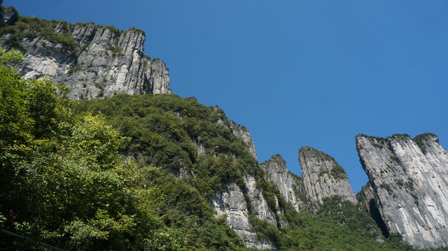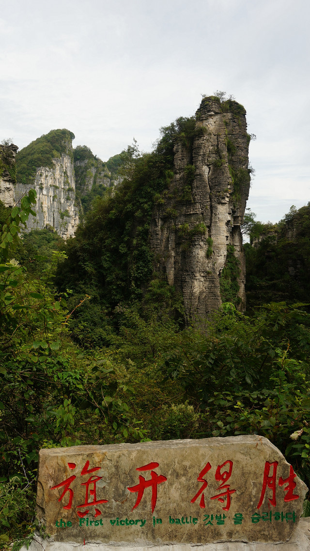 小伙子告诉我们这是玉笔峰、玉屏峰和玉书峰。中间一大块白色的石壁好像屏风一般,故称玉屏峰;玉屏峰右面尖尖的石峰叫做玉笔峰,别说还真是很像毛笔头;玉屏峰左面是玉书峰,说是如同一本本书插在书架上,露出书脊,感觉有些牵强,有点凑数的味道。