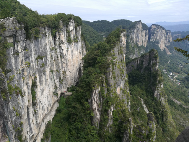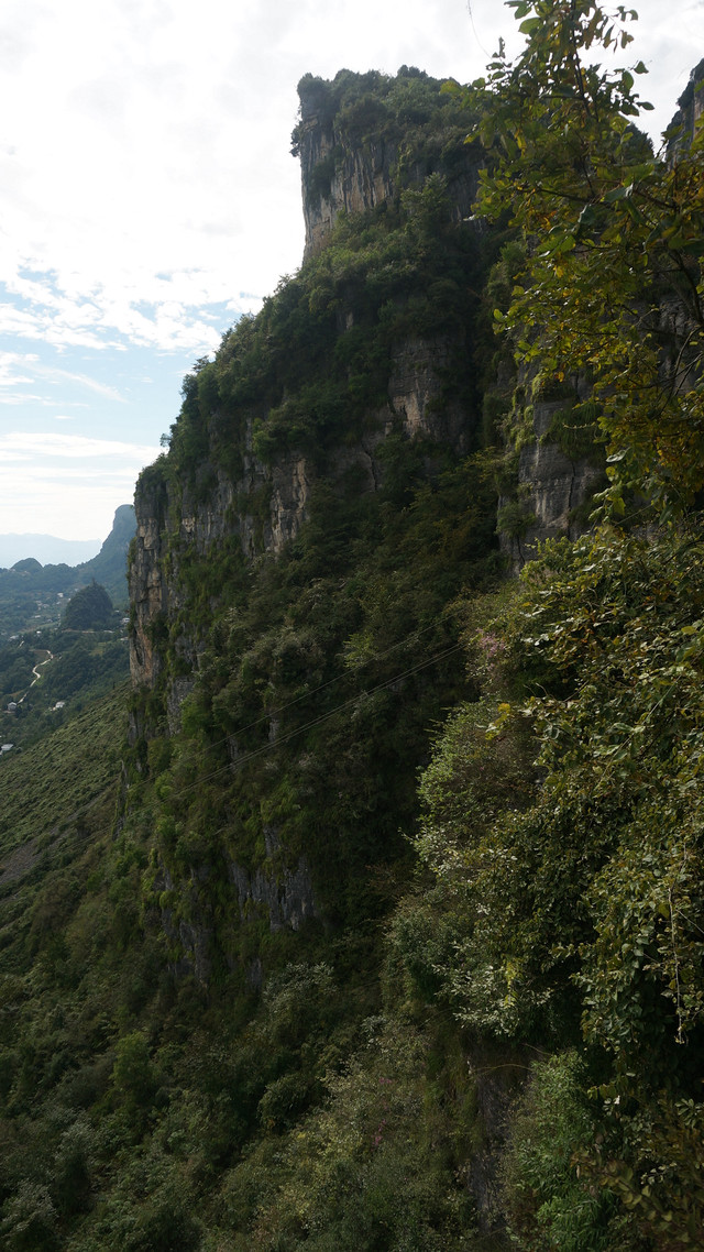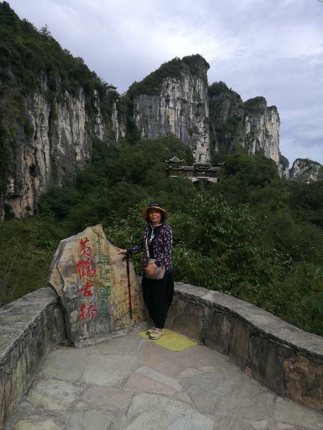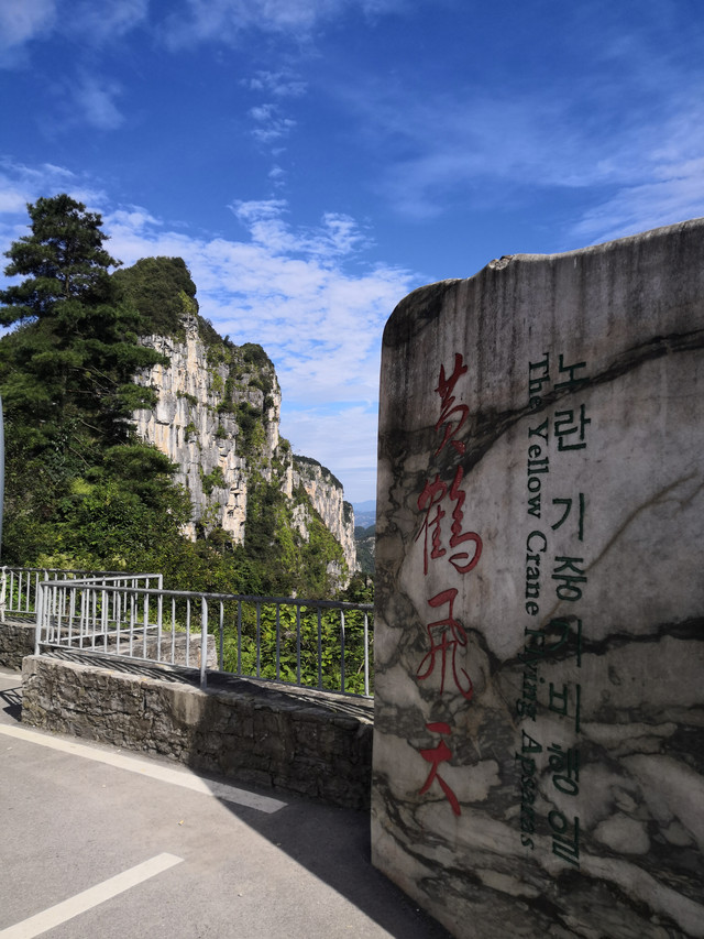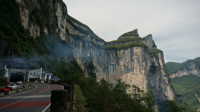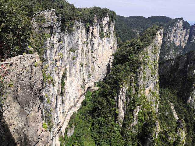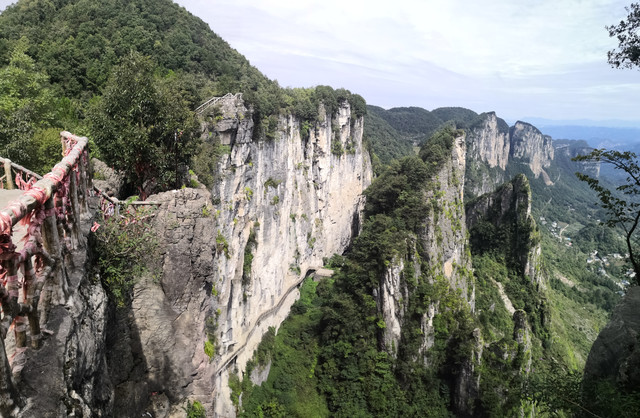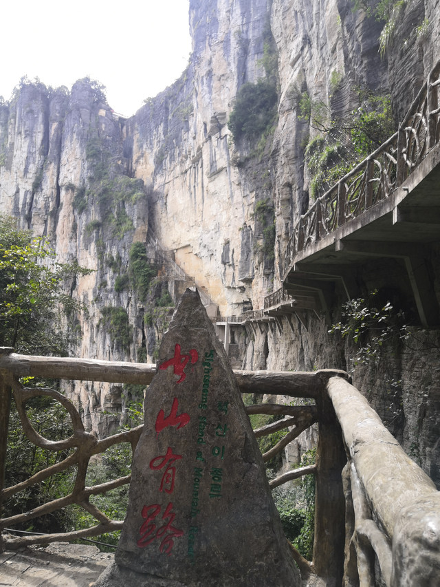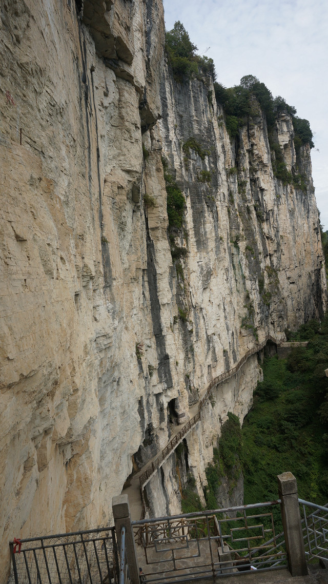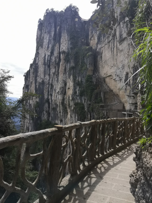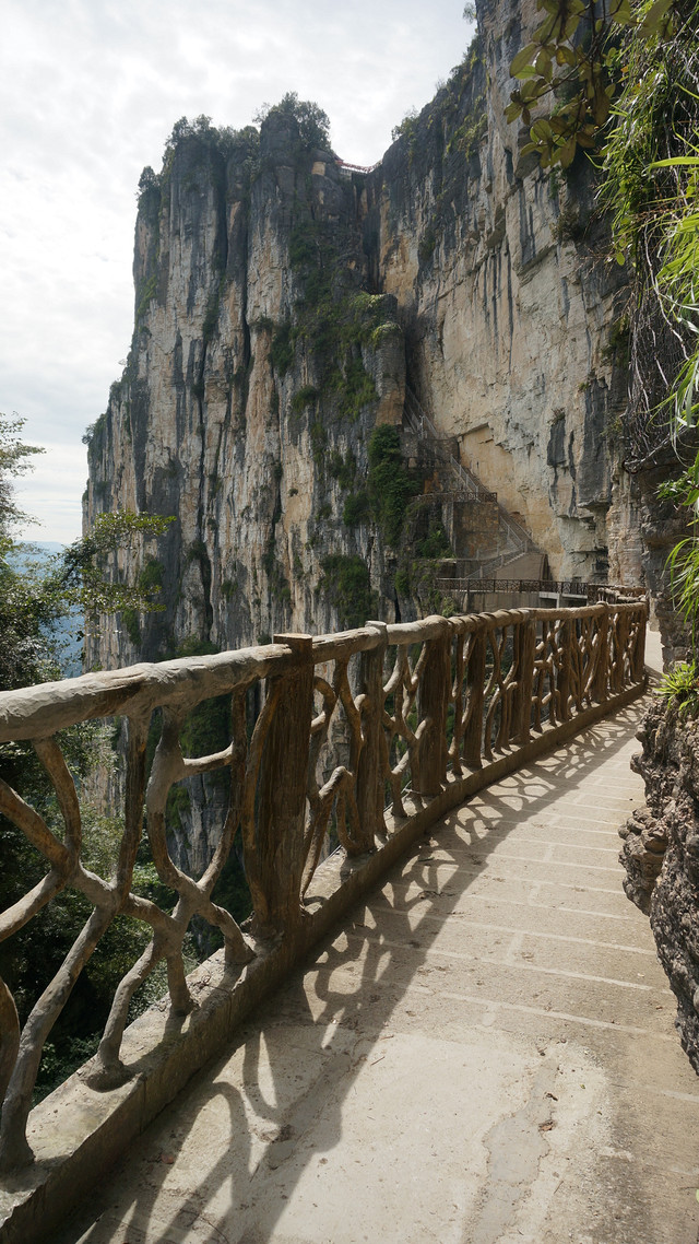 过参师洞后,山路又开始向上爬升,远远可见黄鹤桥和桥后面悬崖上的垂直观光电梯。