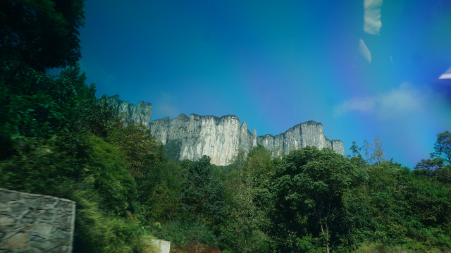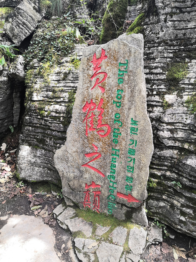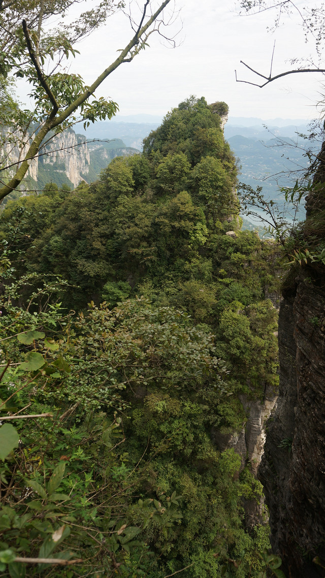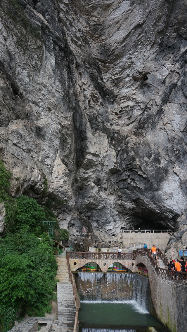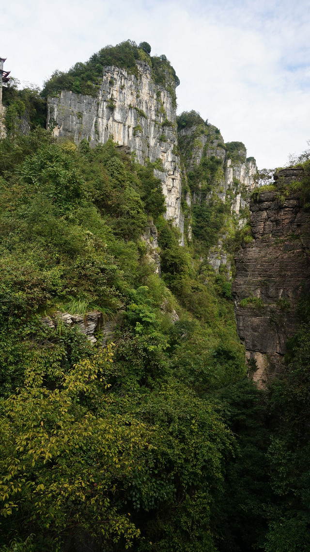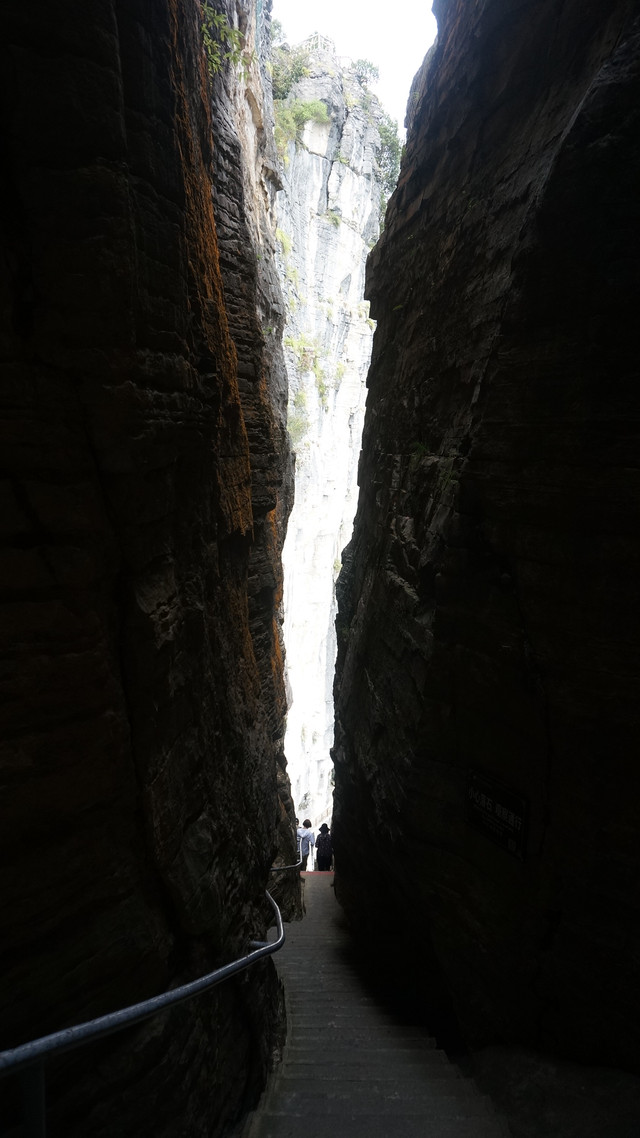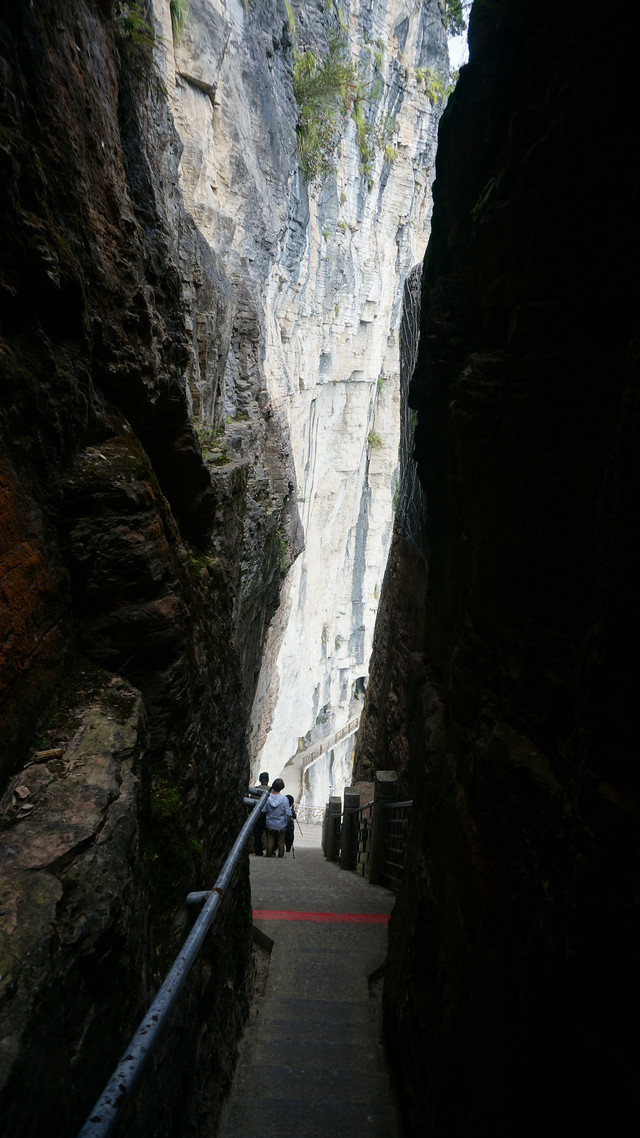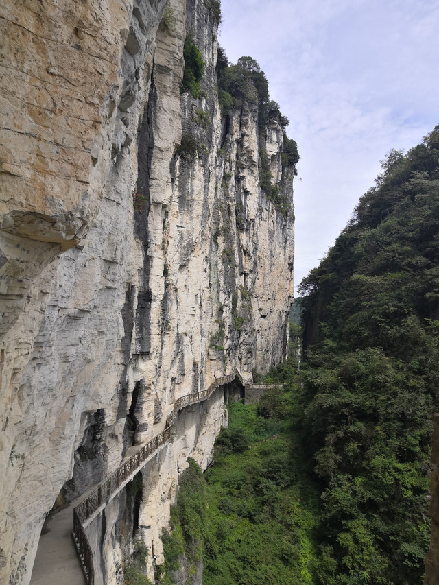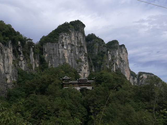 过参师洞后,山路又开始向上爬升,远远可见黄鹤桥和桥后面悬崖上的垂直观光电梯。