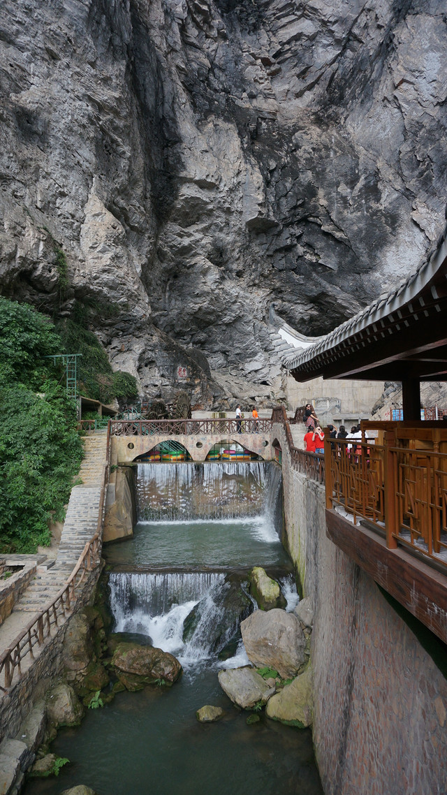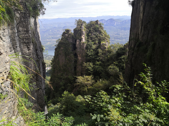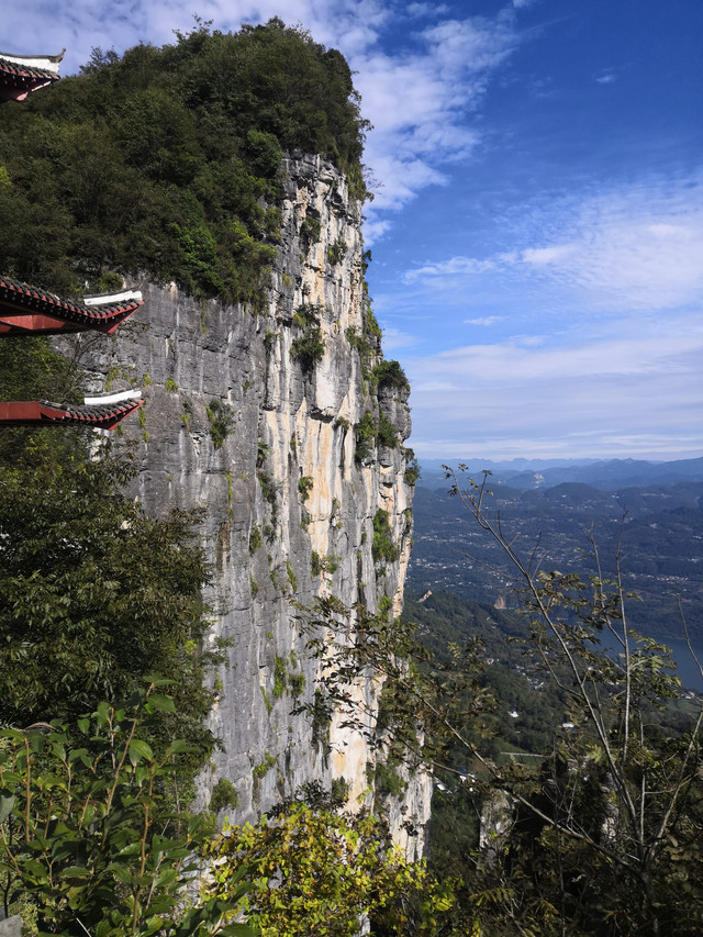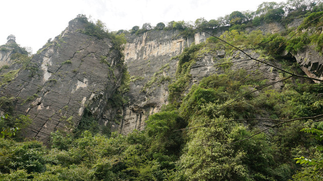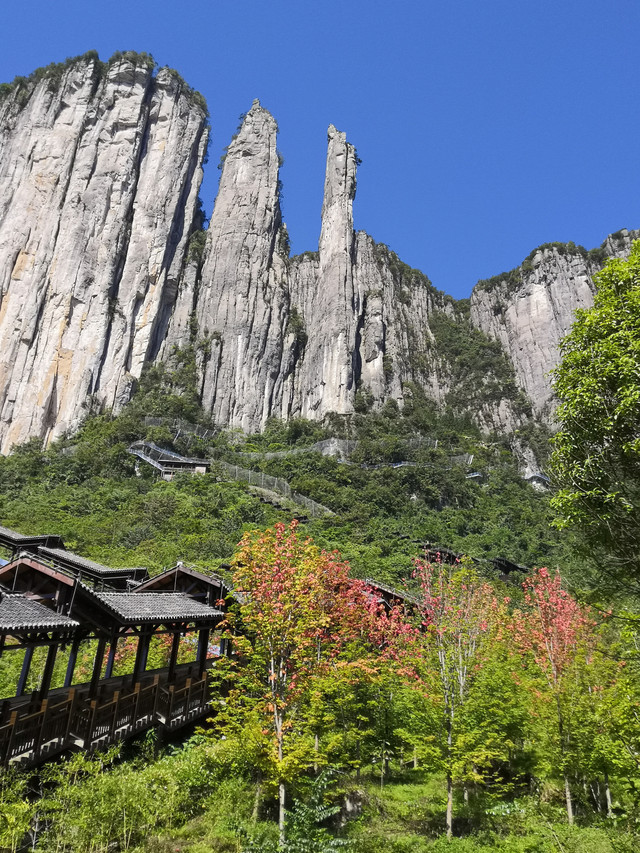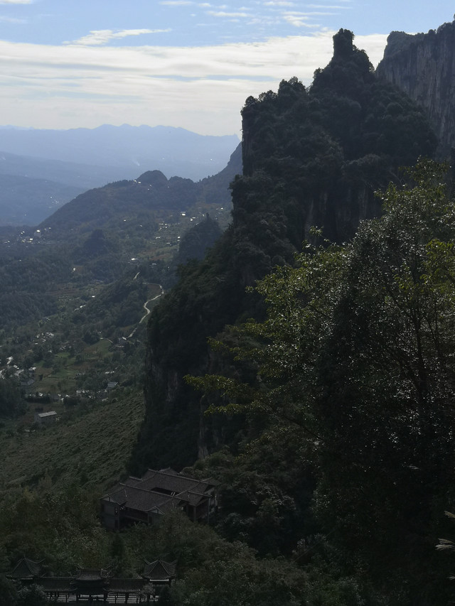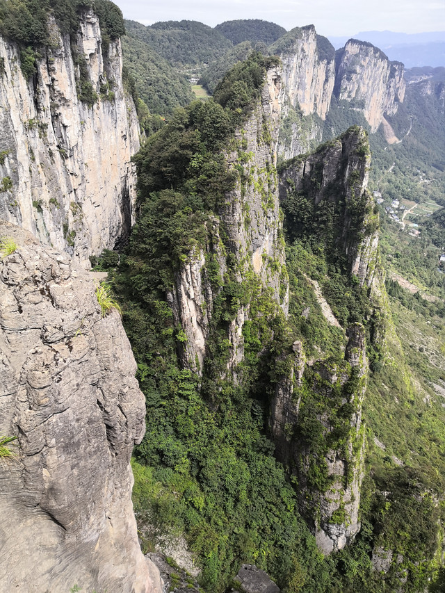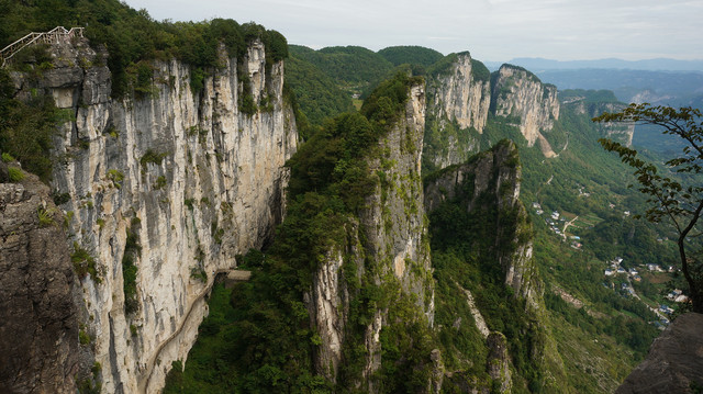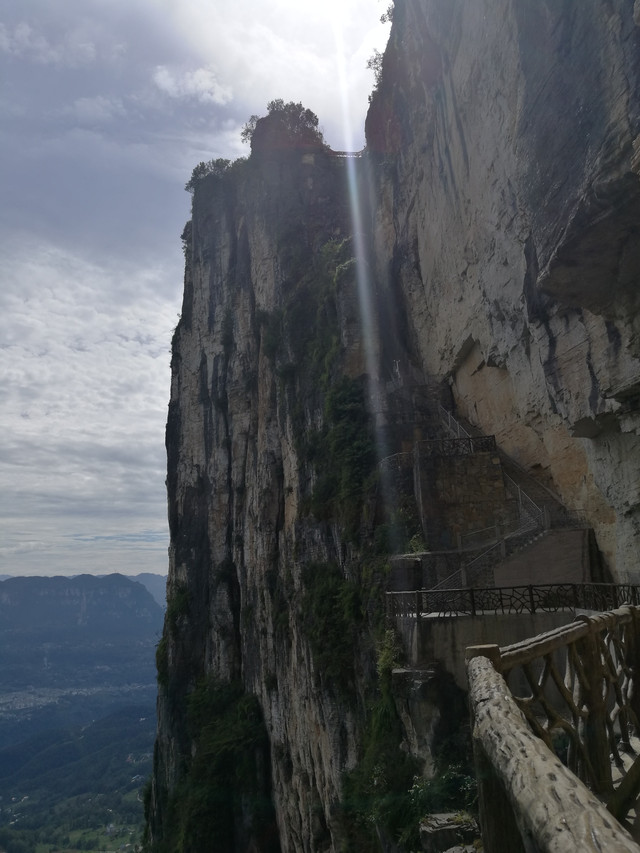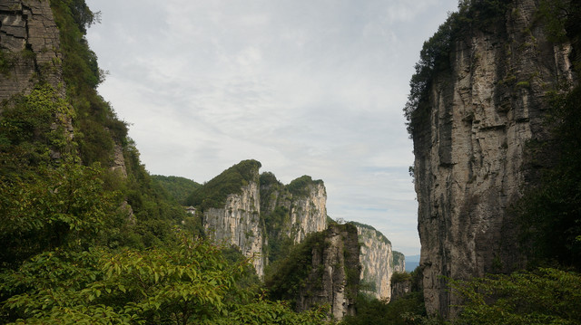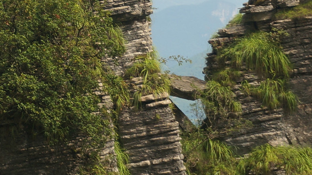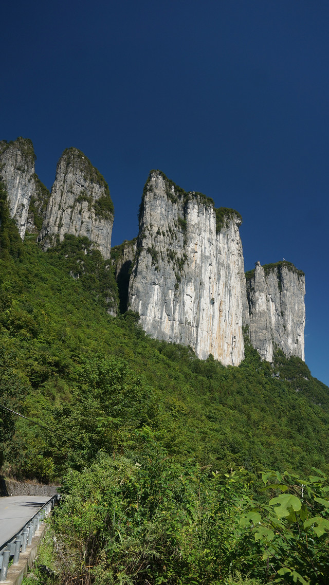 过参师洞后,山路又开始向上爬升,远远可见黄鹤桥和桥后面悬崖上的垂直观光电梯。