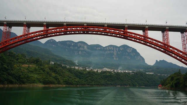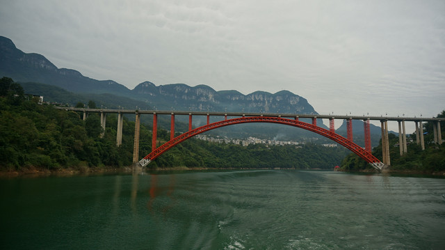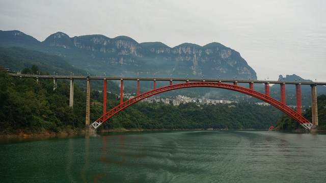 景阳大桥又叫“彩虹桥”,是一座横跨清江的钢管砼拱公路桥。大桥是清江水布垭库区交通复建项目,2008年元月22日正式通车,成为巫山出入武陵山的一座重要桥梁。