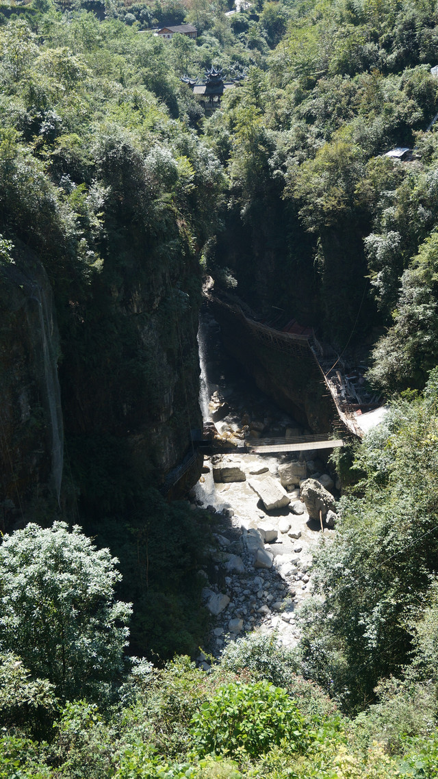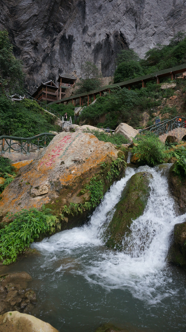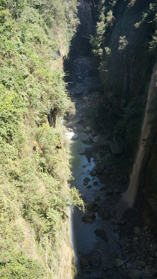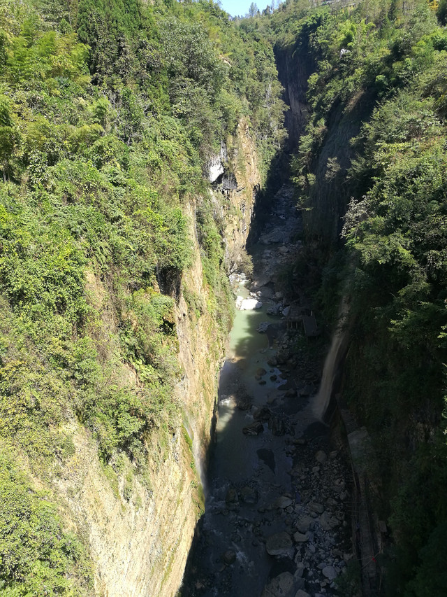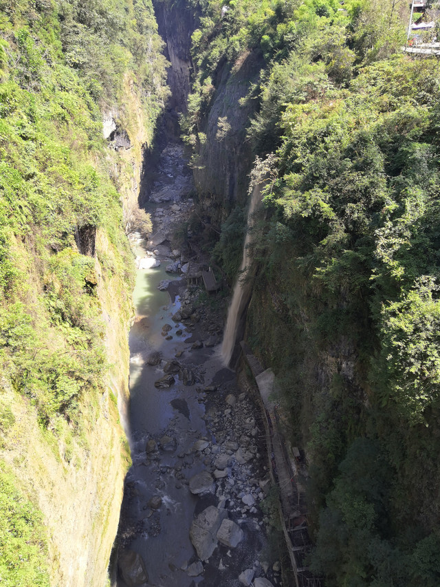 最后来到横跨云龙地缝的桥上,目睹了地缝景区内的惨状,步行栈道全部被冲垮,谷底乱石成堆,小溪里流淌着泥巴汤。惨,真惨,惨不忍睹。