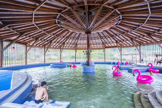 从酒店就可以直接进入花乐汤温泉,因为现在不是冬天,应该水温不是太高,有点进入泳池的感觉。
