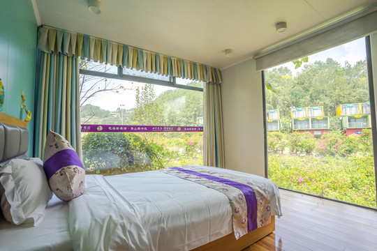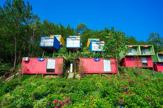 这个是由集装箱改造完成的青春驿站民宿,里面环境还是非常不错的,跟酒店没有什么区别。简约现代的外形,明快醒目的色彩,在山林间高低错落,好像搭起来的一块块彩色的积木。