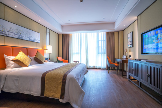 在景区旁边就是一个星级酒店,这个让人挺意外的,毕竟多了一个选择,这次出行选择了一个双人间,橙黄的色调让人眼前一亮,干净整洁的环境让人心情愉悦。酒店是新开的所有设施都是新的。楼下停车也是免费的,对于我们自驾的还是非常友好的。