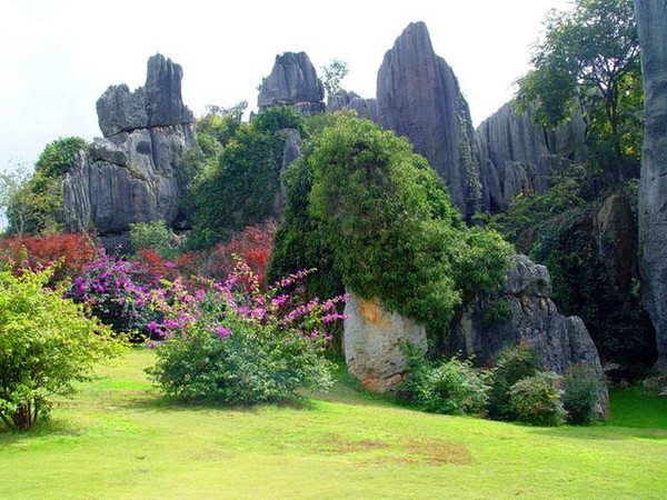 从迷宫般的大石林出来后向外走,经过一片绿茵茵的开阔地就进入了秀美的小石林风景区。与密集的大石林相比,邻近的小石林便显得疏朗、清雅。宽厚墩实的石壁像屏风一样,将小石林分割成若干园林。