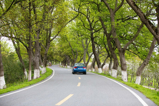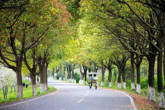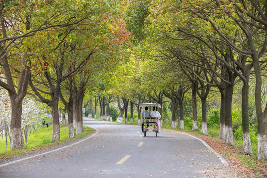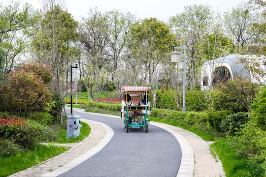 樱花林以东,还有绵延2.8公里长的樱花骑行道路,成了一条樱花花墙,在春日的暖阳微风里,骑个单车或者和家人密友共同漫步在樱花树下,闻着甜蜜的樱花香气,脚步轻快得飞起。