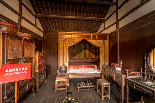 中间是王国维先生的卧室,床前床榻上放有先生当年穿过的鞋子,无论是床还是家具,皆为实木打造而成,处处透露着古色古香的气息。