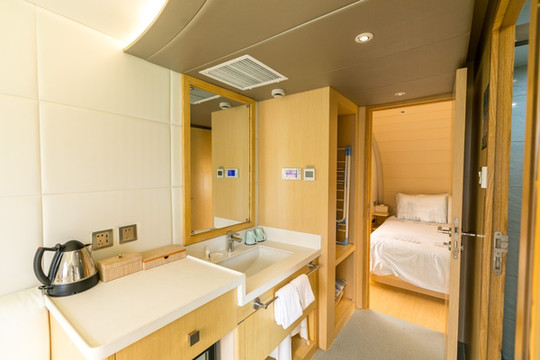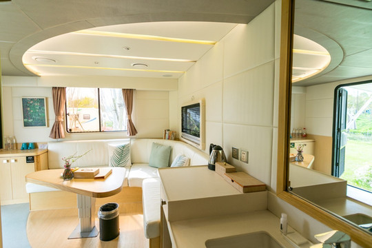 房车本身也像一个豪华公寓,客厅空间不算大,但是五脏俱全,客厅摆放了舒适的沙发座椅和茶几,敞亮大方。房车内还自带wifi、蓝牙功能,手机连上车内的蓝牙,听着自己喜欢的音乐,也可以上网追剧,无比惬意。