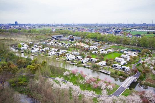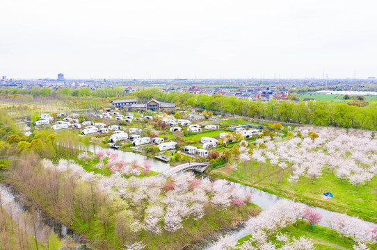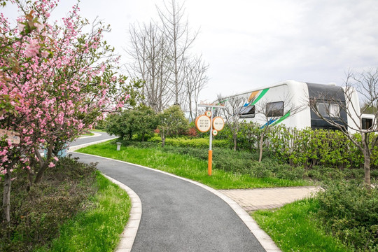 坐落于海宁盐官观潮景区内的房车营地,可以垂钓的水渠将营地与钱塘江隔开,旁边还有百亩樱花林。樱花林以东,还有绵延2.8公里长的樱花骑行道路,成了一条樱花花墙,在春日的暖阳微风里,骑个单车或者和家人密友共同漫步在樱花树下,闻着甜蜜的樱花香气,脚步轻快得飞起。