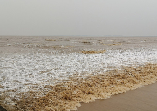 站在观潮胜地公园的观潮台上,随着潮声渐大,看到雾蒙蒙江面现出一条白线,白线渐宽,有人比喻犹如“素练横江,漫漫平沙起白虹”,很贴切。