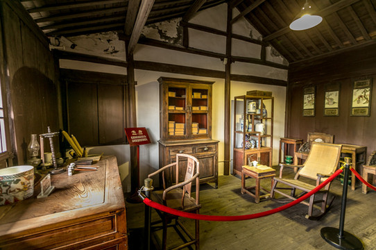 西侧是王国维先生的书房,书桌上摆放着笔墨砚台及一盏煤油灯,一侧的书柜放置有先生的书籍,书柜前还有一把摇椅,书柜旁边还有一个架子,架子上摆放有一些瓷器,整个房间虽然朴素但氤氲着浓郁的书香气息。