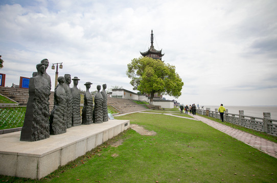 观潮之约雕像。1923年9月28日(农历八月十八)胡适、陶知行、曹诚英等8人应徐志摩之约,相聚此观潮。