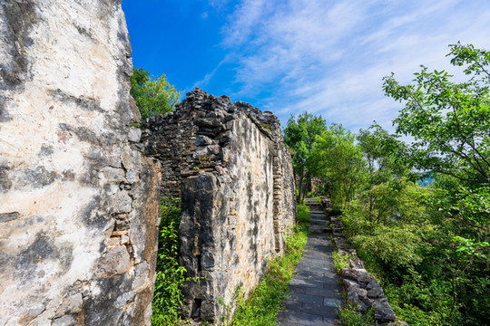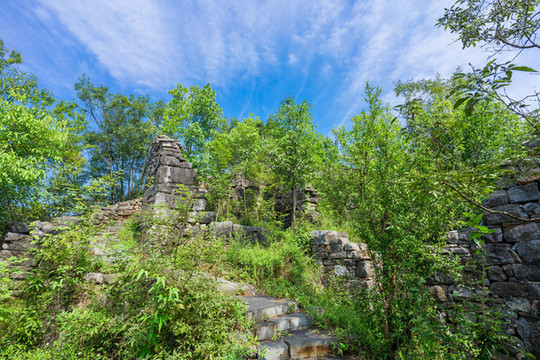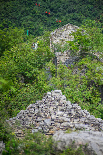 春秋寨海拔270米。古山寨南北长460米自南向北呈条形布局,东西宽8至50米不等,现存石砌房屋158间,一路向上攀登看到的几乎都只有残壁断垣。