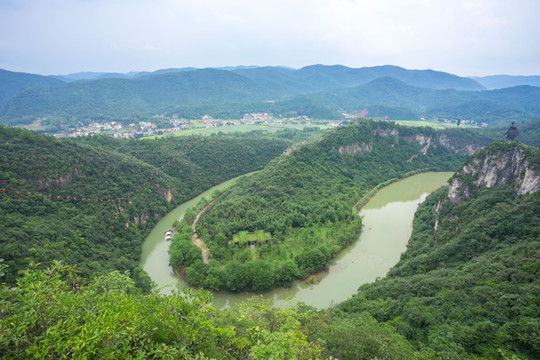 到达望月山顶,遥看鲤鱼山势如刀割斧劈,三面环水,两面绝壁,南北的笔架山与望月山遥遥相对,与茅坪河构成绝妙的“两山夹一水”的八卦图案,很是壮观。