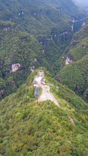 其实整个风景区接待处,包括停车场、小木屋、大门、大崖口观景台都在九路寨大峡谷的东侧山顶的平地上,建在靠峡谷上方的观景台看下面的峡谷一览无遗。