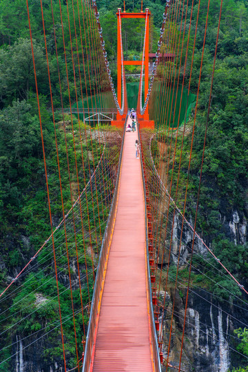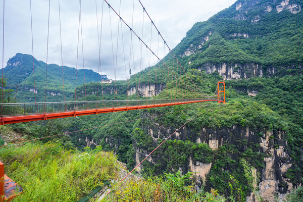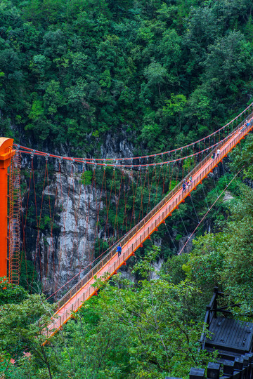 从山上的栈道可以清晰的看到下方两河口至大岭头索道还有建在另一条峡谷上面长达220米的亚洲第一索桥,直达象鼻山。