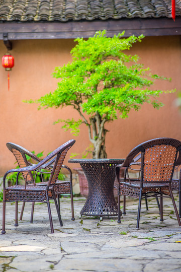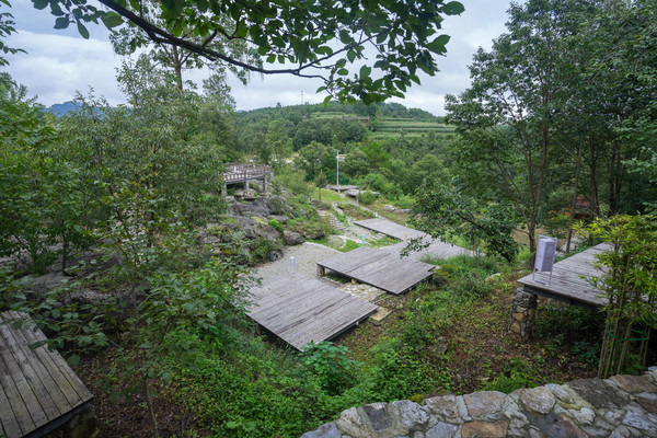 露天茶座,就在这山水之中,质朴素雅,古香幽动。令人一见倾心。客栈前有一棵古银杏,客栈后是远山田舍。