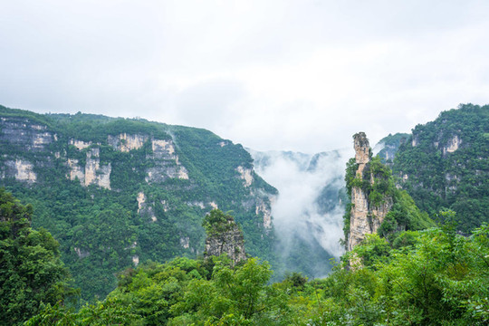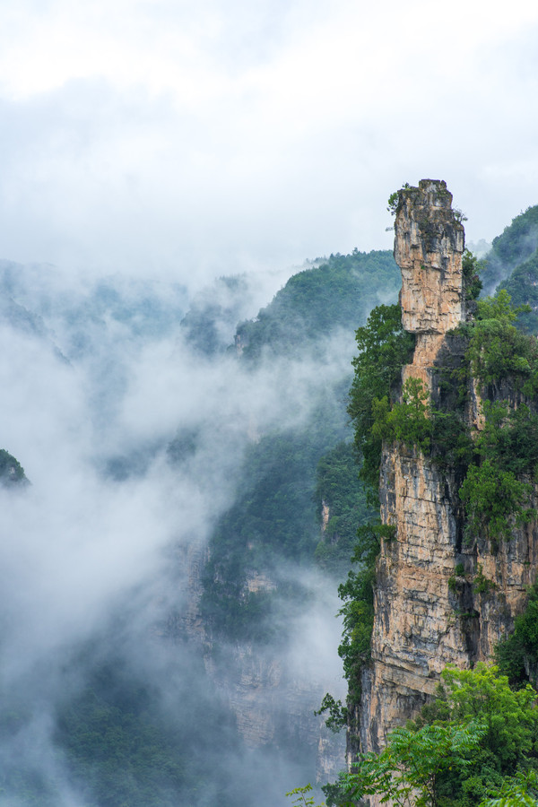 在进风景区大门不远的地方,来到一处观景平台,峡谷排山倒海般的气势摄人心魄,令人兴奋不已。云雾缭绕,颇有奇峰云海的感觉。它是典型的喀斯特地貌。这个神似披着战甲的人形险峰,这就是著名的楚王峰。