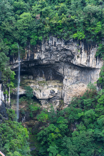 崖壁的下方豁然出现一个山洞,洞上古藤互相纠缠着吊在洞口,从洞里面流出来的山泉在洞外的石壁上散开,形成一道瀑布。这就是黄龙洞