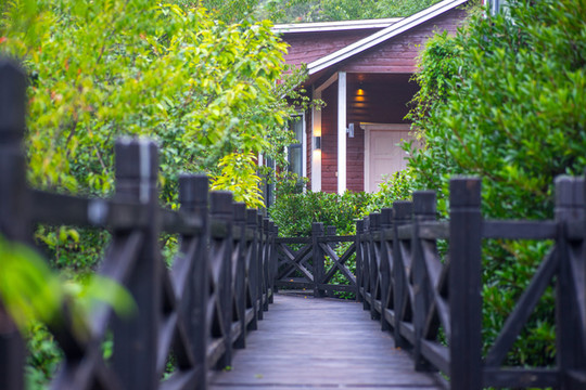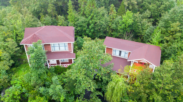 在这里还可以住进山谷里的木头房子,小隐于山林大抵就是如此吧。隐没在森林中的七栋全木质结构木屋别墅,全部采用国外进口,并经过防腐处理的南方松木。红木外观加以白色勾边,格外显眼,又与山林融为一景。