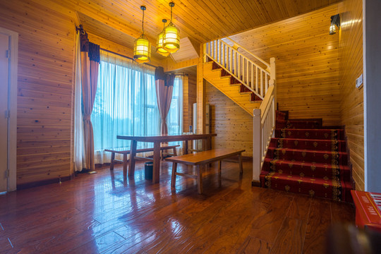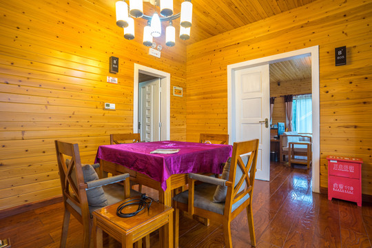 木屋别墅共有17个房间,简约质感的实木家具,玻璃式的观景窗、观景台让人很容易沉静下来。