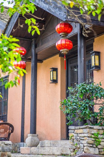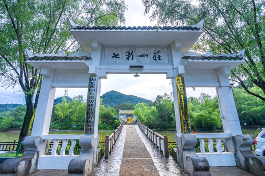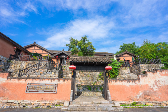 七彩山庄民宿依山而建,很有一种徽派古典园林建筑的创意,青瓦白墙,设计精巧,显示出特有的徽派建筑风格。