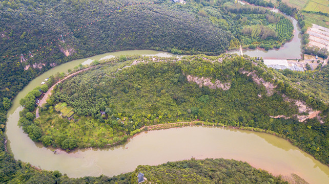 随着缆车的缓缓上升,春秋寨一览无遗。山的形态状似一条鲫鱼,茅坪河环绕而过,就好像一条正在嬉水的鲫鱼,活灵活现。而春秋寨就建在鱼的“背鳍”之上,东、西、北三面临水,南面一道断崖,地势险峭,易守难攻,古人的智慧由此可见。
