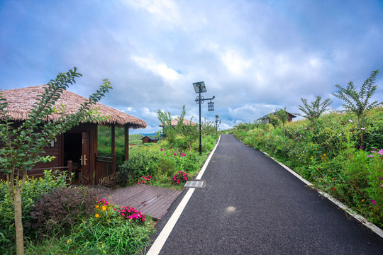 一路沿着石砌而成的山路陡峭而上,大约一个小时直接返回了景区的停车场的门口。旁边依山傍水的就是景区的七彩山庄民宿。