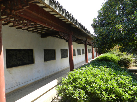 我们从纪念馆的大门进入院内,里面是一个很大的长方形院落,院中树木葱茏,两侧是长长的本草碑廊,在白色墙壁上嵌着96块黑色大理石,石上刻有著名画家蒋兆和1983年所画的李时珍像、明末清初著名文学家顾景星撰写的《李时珍传》、明代文坛泰斗王世贞的《本草纲目序》以及从《本草纲目》上选下来的128种本药图。在碑廊的最后,还刻有李时珍次子李建元的《进〈本草纲目〉疏》和配诗的“蕲阳八景”古图,细细品来,韵味无穷。本草碑廊是纪念馆的第一重院落,在每块石碑上用建筑元素装饰加以对石碑的说明,地面铺设文化石,墙面使用真石漆饰面使碑廊与纪念馆更显整体,更好护理。