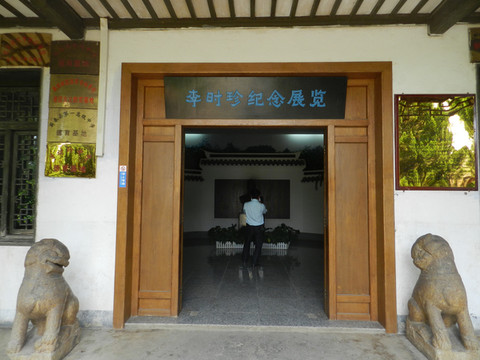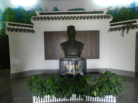 走到碑廊的尽头,看到两座石雕狮子蹲守大门,入厅正中是高约3米的李时珍塑像,这里是李时珍纪念展厅,里面陈列着有关李时珍的历史文物、古籍缮本、字画、近现代名人书画、文献、图表、照片、雕塑等1000余件,形象系统地介绍了李时珍的生平和《本草纲目》的伟大成就。藏品中有诸多古籍善本,尤以《本草纲目》自明清以来的各种版本弥足珍贵。还有顾景星、章学诚等明清学者为他撰写的传记,有郭沫若的两次题辞,有著名美术家蒋兆和先生亲笔画的李时珍像以及莫斯科大学的李时珍雕像照片。背面墙壁有大型壁画《李时珍武当采药图》。这些文物集中展示了李时珍平凡、伟大的一生。大量文物、翔实的图片资料,充分展示了伟大医学家李时珍毕生所作的卓越贡献和深远影响。