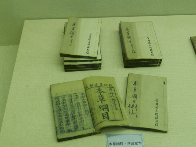 纪念展厅的第四部分是“《本草纲目》 东方巨典”。明世宗嘉靖三十一年(1552年),34岁的李时珍着手按计划重修本草。由于准备充分,开头还比较顺利,但写着写着,问题就来了:所谓本草,是古代药物学的代称。它包括花草果木、鸟兽鱼虫和铅锡硫汞等众多植物、动物和矿物药。由于其中绝大多数是植物,可以说是以植物为本,所以人们又将药物直称为“本草”。东汉《神农本草经》成书,到李时珍诞生前的400余年间,历代本草学家都有不少专著问世,但却从未有一部能概括这一时期药物学新进展的总结性著作。李时珍意识到了它的分量,却仍未料到,药物是那样的多种多样,对它们的性状、习性和生长情形,很难全部心中有数。比如,白花蛇,同竹子、艾叶,本是蕲州的三大特产,可以主治风痹、惊搐、癞癣等疾病,是一味贵生药品。李时珍曾跟着捕蛇人亲自上山,捕捉到一条白花蛇,仔细一看,果然和书上讲的一模一样。李时珍在任职太医院期间,经常出入于太医院的药房及御药库,可以比较、鉴别全国各地的药村,也有机会饱览皇家珍藏的丰富典籍,可能就有明孝宗下诏太医院编修的国家药典《本草品汇精要》。 回乡之后,继续《本草纲目》的写作。《本草纲目》是李时珍以宋朝唐慎微的《证类本草》为资料主体增删考订。就这样,李时珍经过长期的实地调查,搞清了药物的许多疑难问题,于万历戊寅年(公元1578年)完成了《本草纲目》编写工作。全书约有192万字,52卷,载药1892种,新增药物374种,载方10000多个,附图1000多幅,成了我国药物学的空前巨著。其中纠正前人错误甚多,在动植物分类学等许多方面有突出成就,并对其他有关的学科(生物学、化学、矿物学,地质学,天文学等等)也做出贡献。达尔文称赞它是“中国古代的百科全书”。